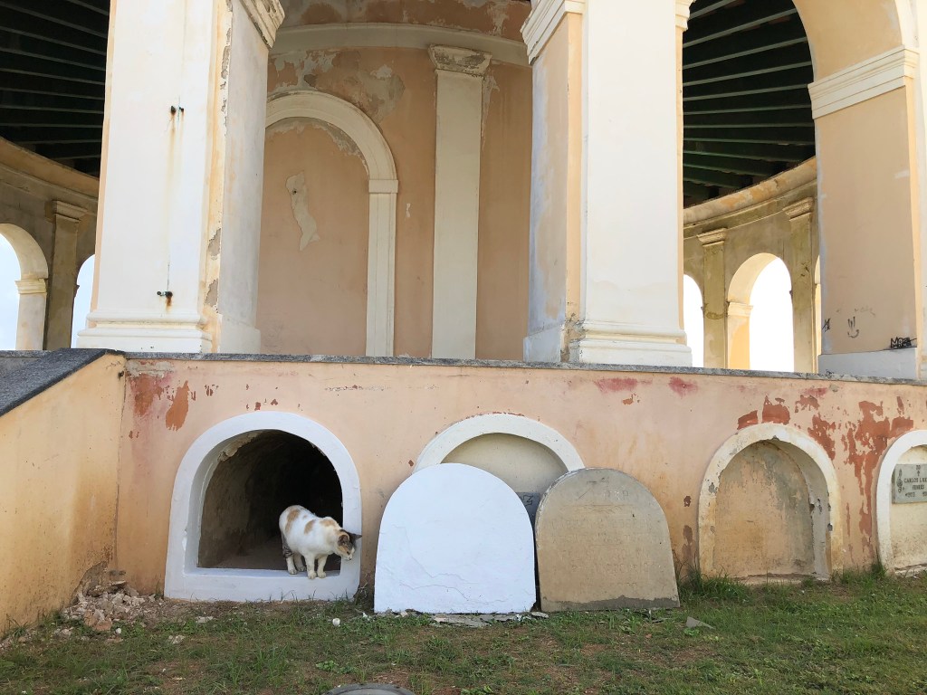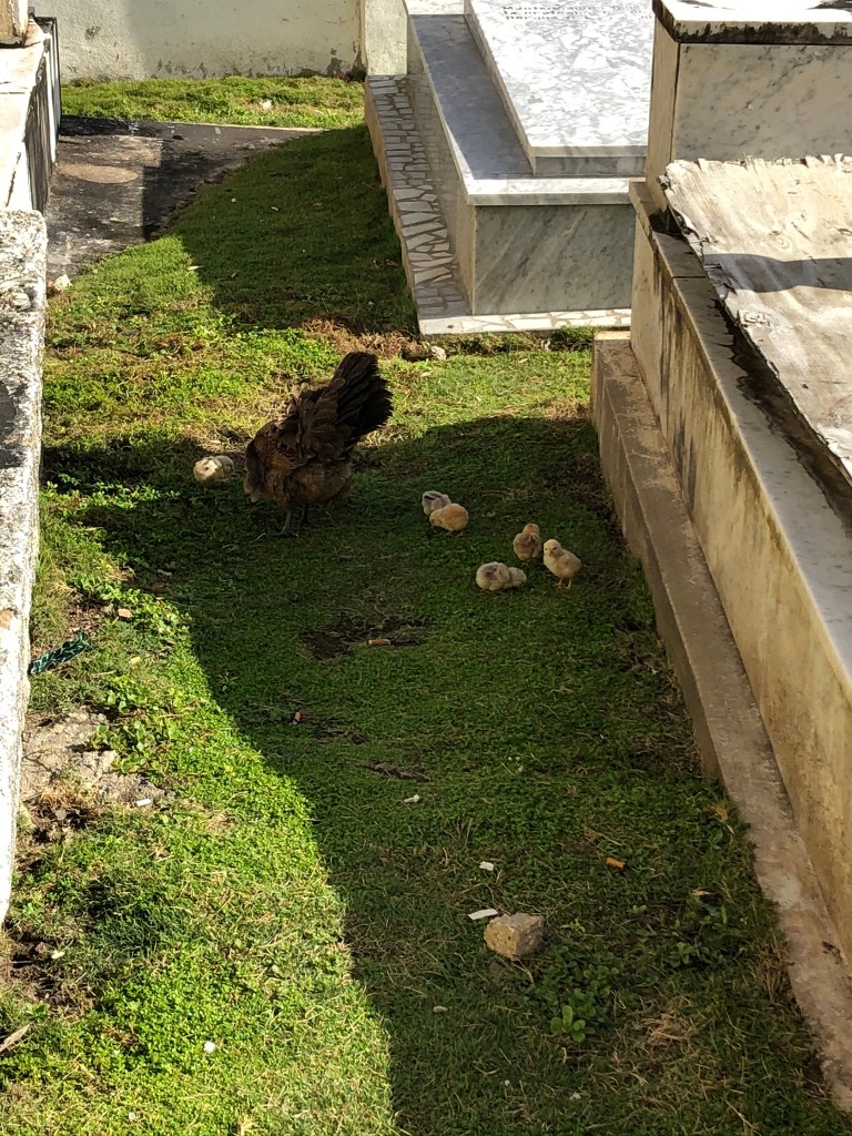 There are two main sections to the cemetery and one main avenue that takes you throughout the property. There is a domed cupola in the western section. As I walked I was greeted by a cat and her friends, a hen and her chicks.